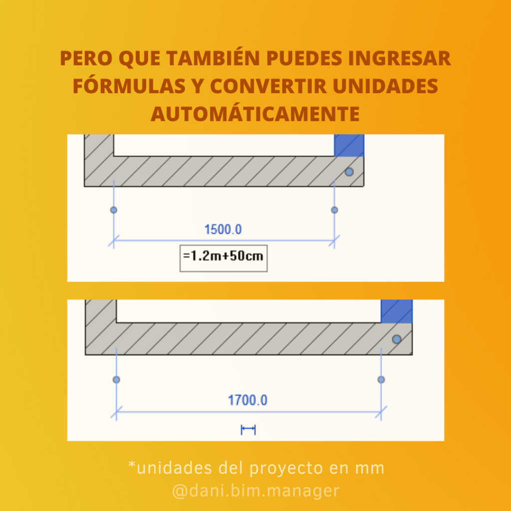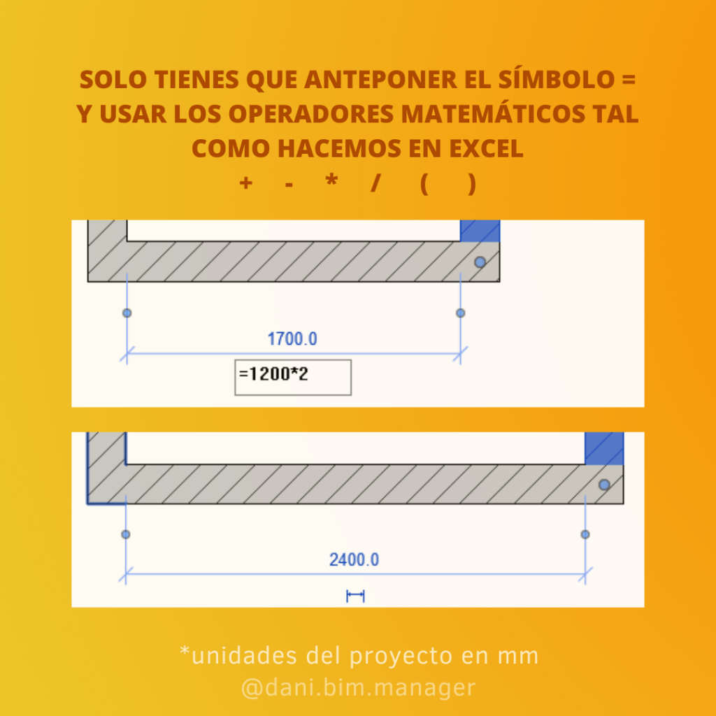 En Revit podemos ingresar directamente formulas en las cotas, cotas temporales (en azul) y además en parámetros para controlar las dimensiones de los objetos referidos a estas. Solo tienes que anteponer el símbolo = antes de las variables y operadores matemáticos tradicionales tal como lo harías en software como Excel.