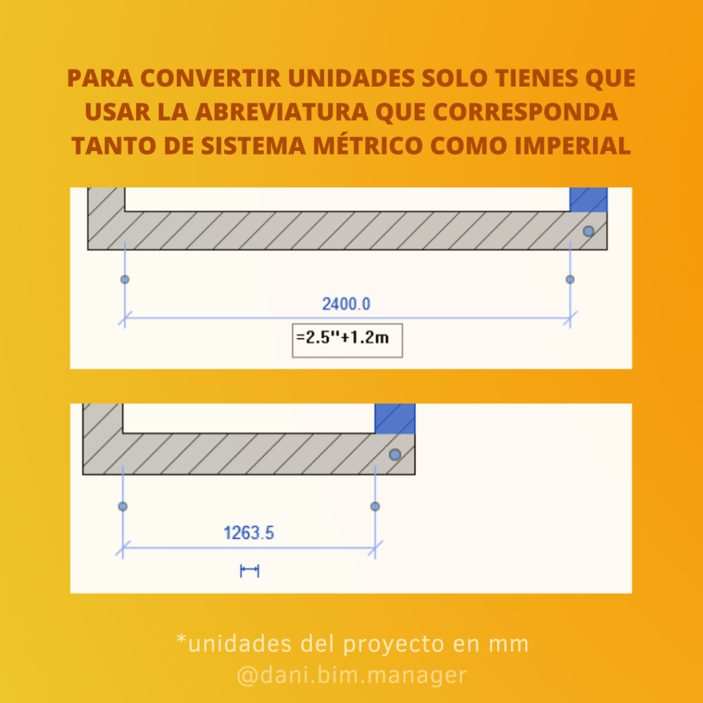 Podemos especificar las unidades de los datos si añadimos las abreviaciones de unidades y actúa como conversor de unidades entre sistema métrico e imperial. Siguiendo el ejemplo anterior si anotamos =1000 mm + 50 cm + 25 cm + 100 mm el resultado es 1850 mm.