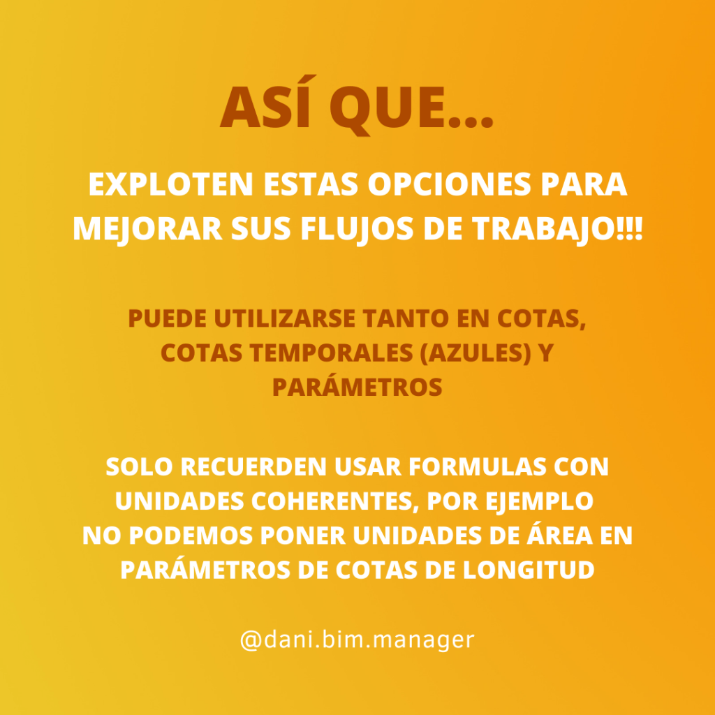 Solo recuerden usar fórmulas con unidades coherentes, por ejemplo, no podemos poner unidades de área en parámetros o cotas de longitud. Como detalle, en las familias y en parámetros globales de proyecto el símbolo = ya viene incluido y además podemos llamar otros parámetros como variables.