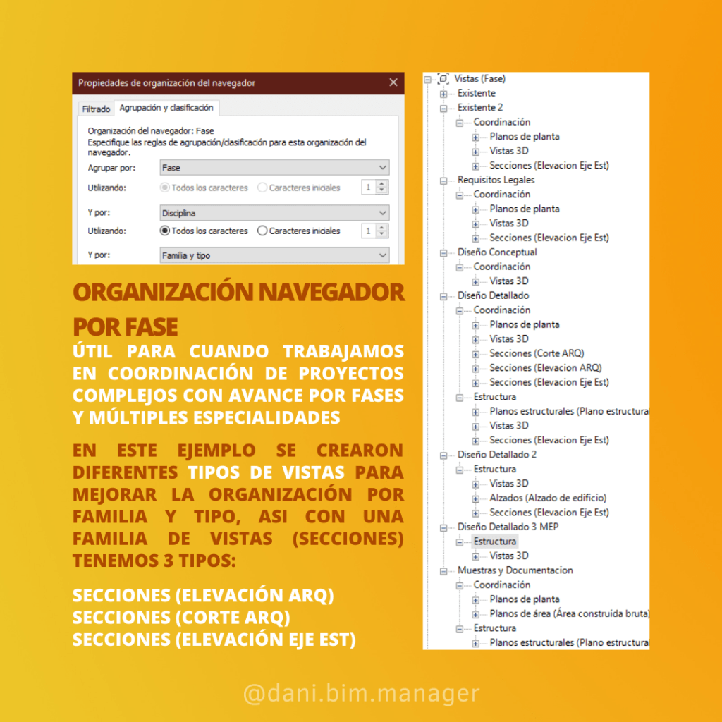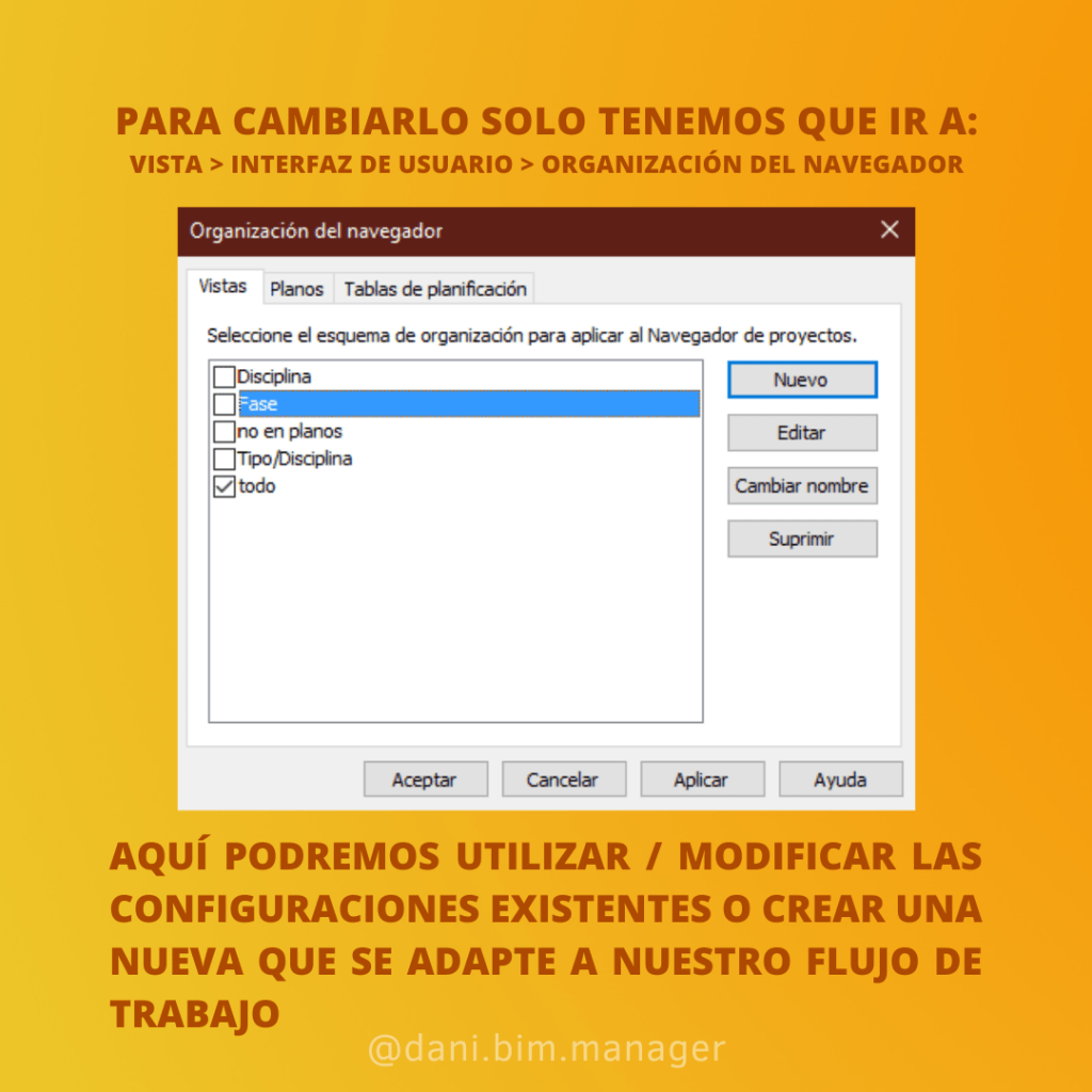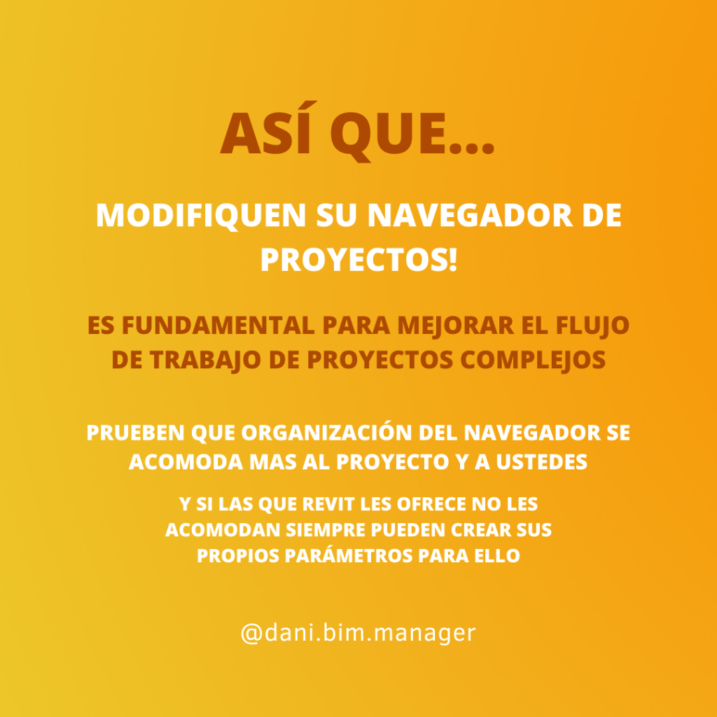 Te invito a crear tu propia organización del navegador de proyecto pensada en tu trabajo, las especialidades que desarrollas o la etapa de proyecto en la que aplicas y veras como se incrementa tu velocidad para encontrar la información. Si trabajas en una oficina, despacho o con otras personas es importante que estandaricen la forma de organizar las vistas para agilizar el traspaso de información, es difícil encontrar información en modelos que perteneciendo a un mismo proyecto cada uno se ha organizado de manera distinta.