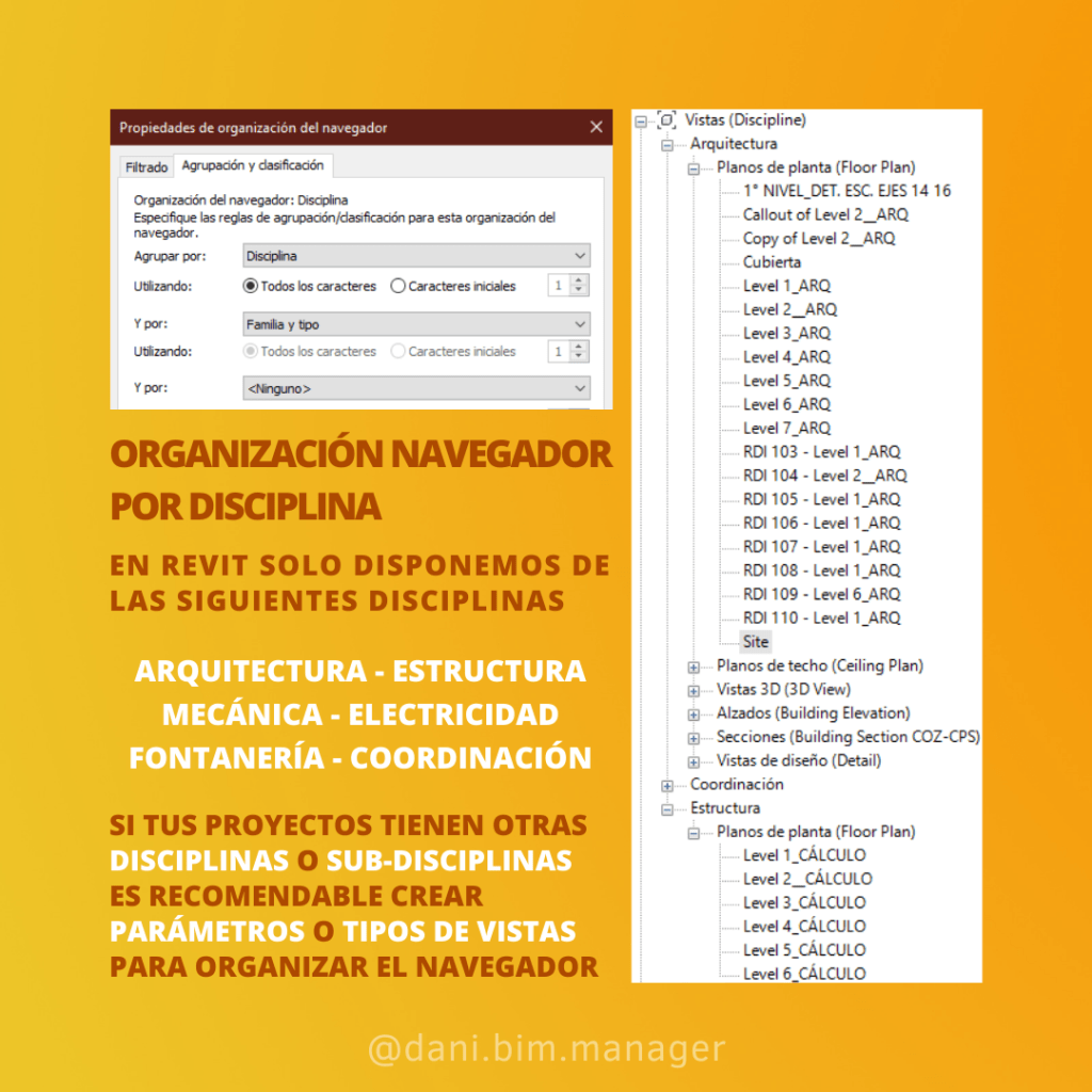El software trae además una organización por Disciplinas y luego por Familia y Tipo de cada vista, pero aplica solo con el listado de disciplinas definidas en Revit: