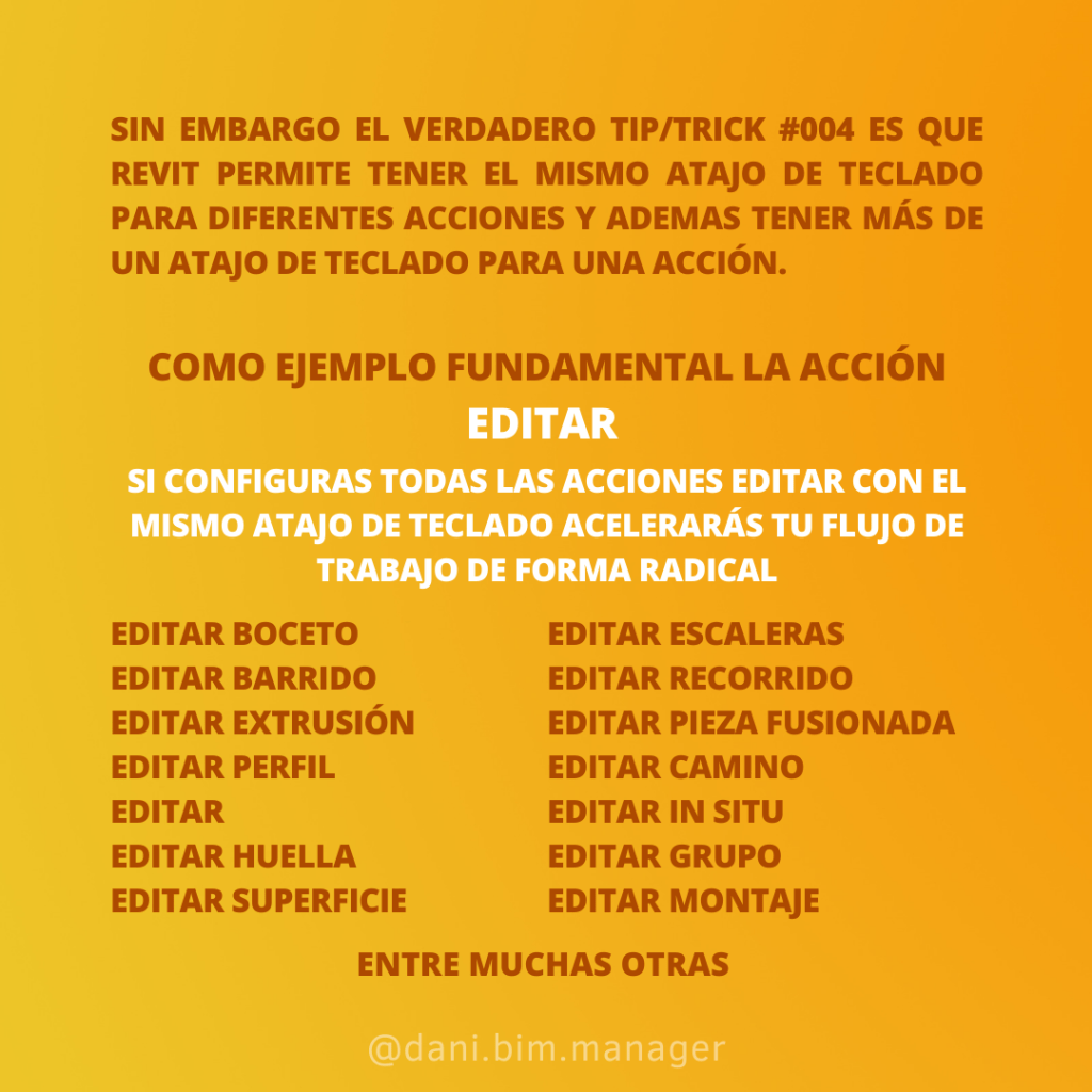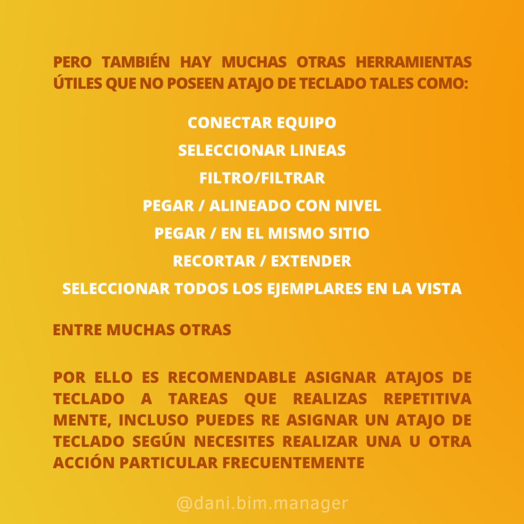 Ahora el mejor de los consejos que te puedo dar es aprovechar que Revit permite tener el mismo atajo de teclado para diferentes acciones y al mismo tiempo tener más de un atajo de teclado para una acción.