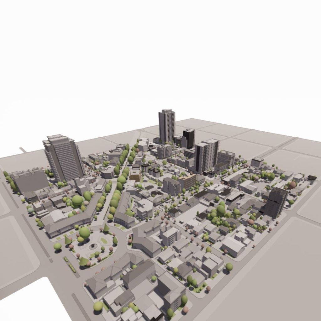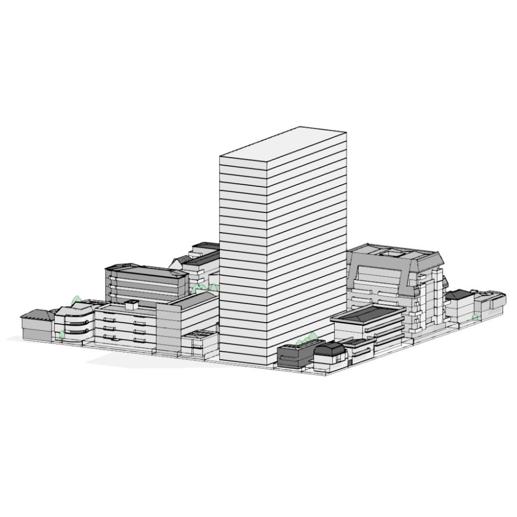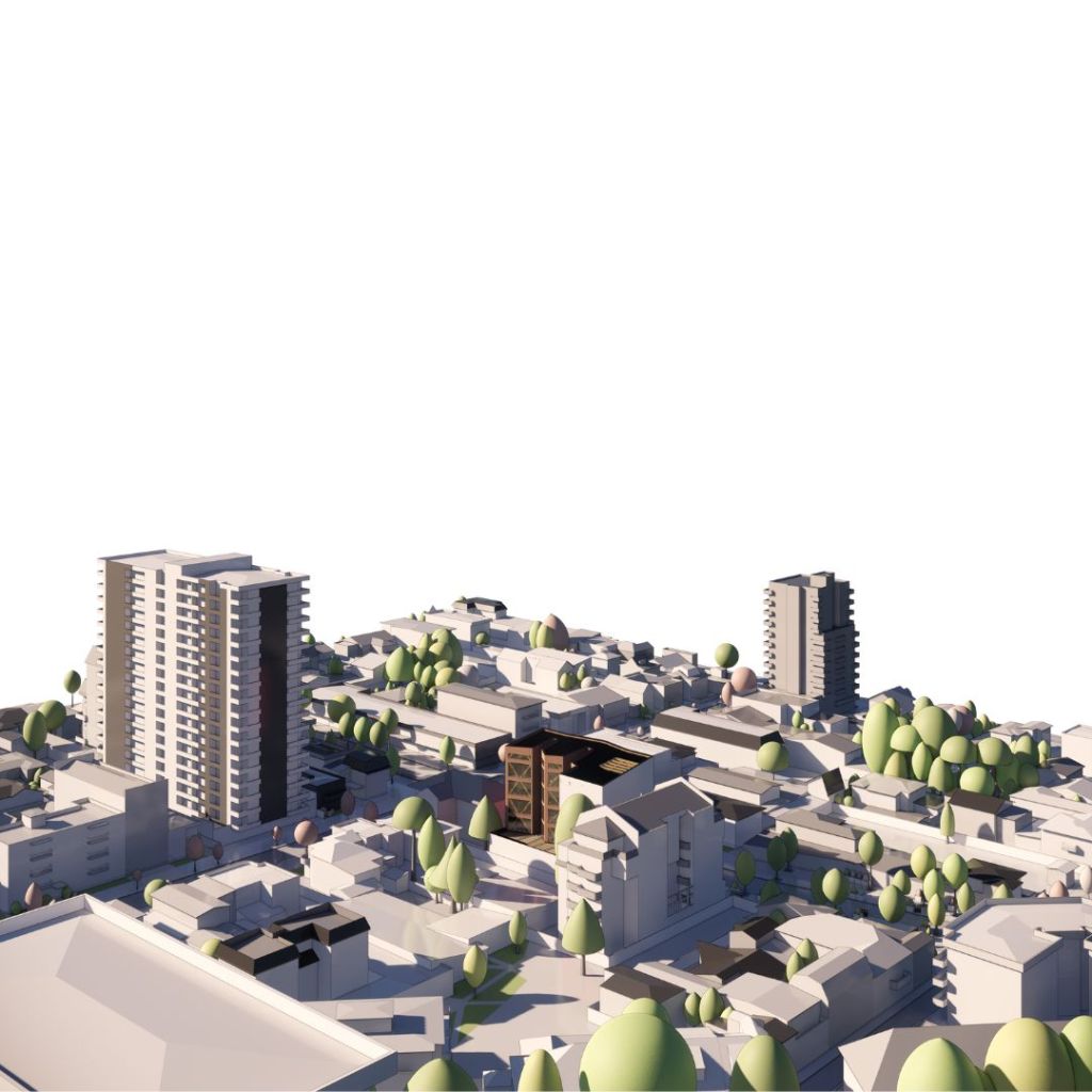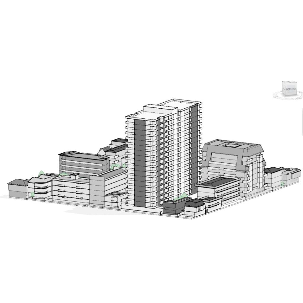 Para ello modele detalladamente el contexto con los edificios cercanos que generarían los mayores conos de sombras era lo principal, pero un según uso era generar las piezas para cortar una maqueta en cartón en máquinas CNC. (2×1) El contexto es en la ciudad de Concepción, Chile, en los análisis urbanos posteriores se puede ver gran parte de la comuna.