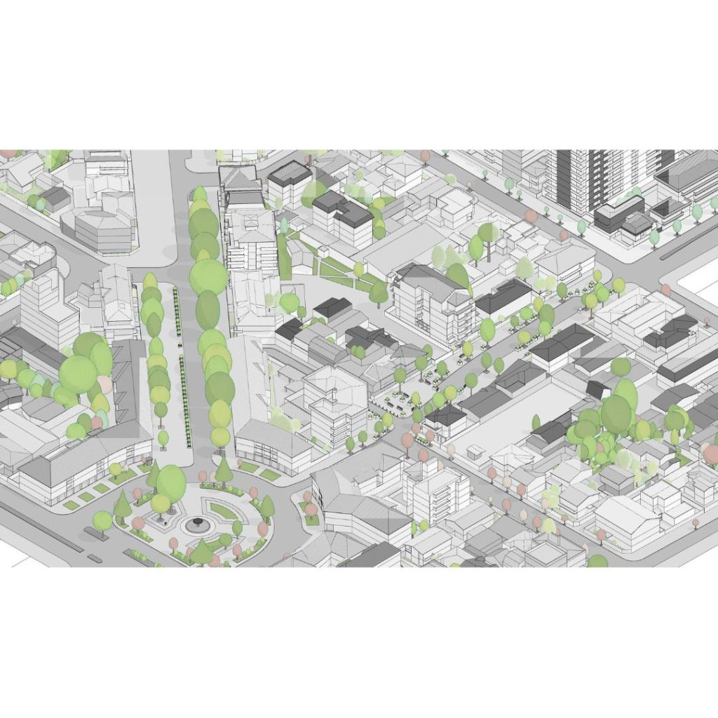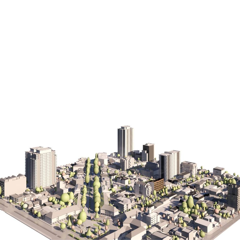 El levantamiento de información fue a partir de CAD de Levantamientos Urbanos, Google Earth y Google StreetView y la modelación detallada de cada manzana alrededor del proyecto venia acompañada de plantillas para aislar las piezas y contornos para cortar en CNC como les comentaba.