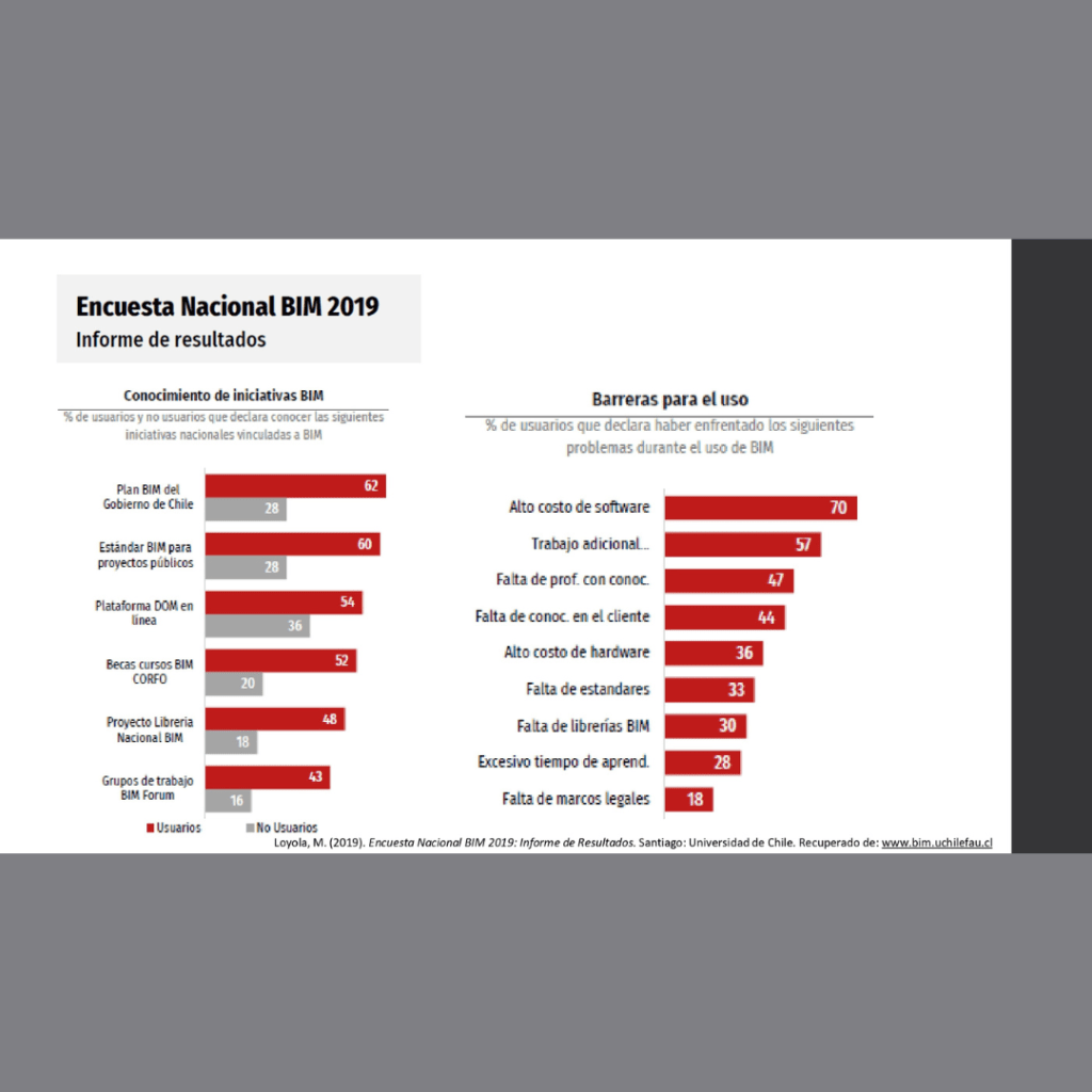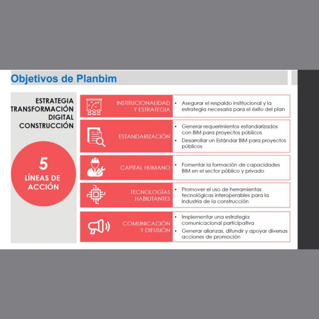 La presentación la desarrolle en 3 ejes: ¿Cómo abordar proyectos BIM?, Implantación BIM y Ejemplos aplicados. Esto pensando en quienes comienzan a descubrir esta área y deben saber que necesitan como por ejemplo formación, software, planificación de procesos, entre otros elementos y por otro lado como esto aplica para que se motivaran.